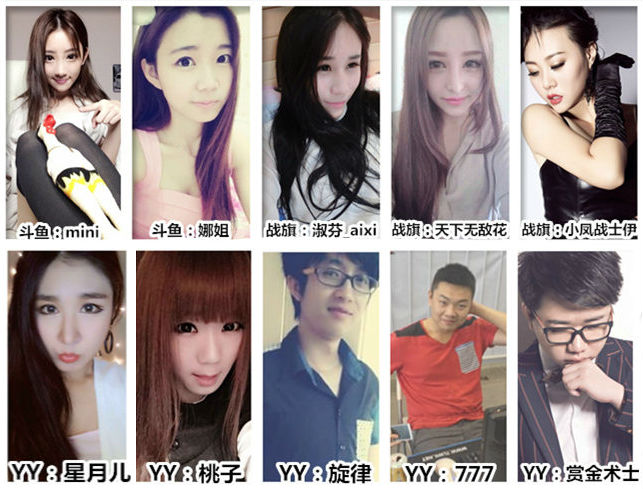 YY主播:星月儿(频道:174180)、桃子(频道:218249)旋律(http://www.huya.com/xuanlv)、777(http://www.huya.com/se7en)、赏金术士(http://www.huya.com/shangjin)、旧梦(http://www.huya.com/986115615)