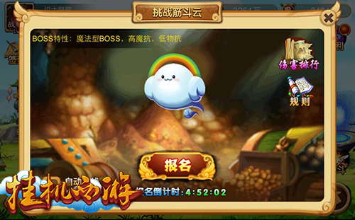 只能挑战玩家不过瘾?新版本全新功能,只要你满30级,萌萌哒筋斗云和人参果两大神将主动来战,让你体验过瘾!在每天固定时间内,只要玩家报名参加挑战,就会获得一定金币奖励;若成为伤害中的佼佼者或者被这两位神将看中的玩家还可获得他们的精魂作为奖励哦!报名的人很多,大侠,你再不赶紧来就赶不上啦!