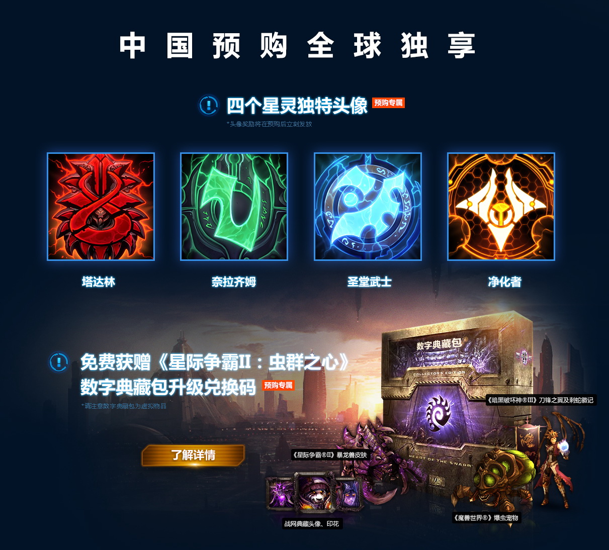 即日起至正式发布前,中国玩家预购任意版本的《虚空之遗》游戏,都将在下一次登录进入《星际争霸II》游戏的时候获得国服专属的四款星灵主题战网头像,以及一枚免费升级《星际争霸II:虫群之心》数字典藏包的兑换码。这枚升级兑换码将为你解锁额外的游戏内奖励,包括: