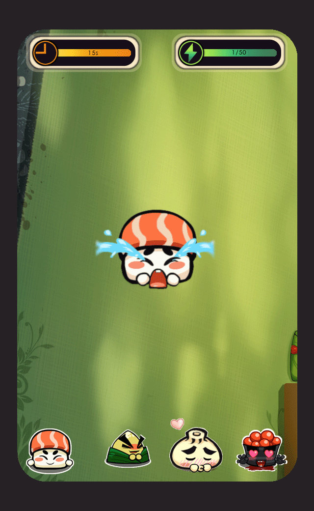 在游戏的过程中,四种角色会轮番出现,用各种表情动作或者轻蔑的话挑衅你,这个时候完全不用压抑自己的怒气,拼命的戳戳戳,你就会发现他们其实是纸老虎,碰碰它们就哭了,有没有觉得很解气。每次玩游戏的时间控制的很短,大概只有15秒,不会占用太多的时间。看见角色出现就要迅速的去击败它,不然一晃神,调皮的主角就会躲过攻击,后悔也没用。游戏中美食的生命由屏幕上方的闪电标识体现,随点击次数的增长,闪电值随之减少,并且美食的体形随点击次数增长而变大,等到闪电值到零就能获得胜利了。