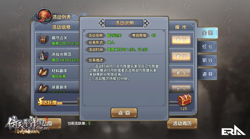 镇守边关活动期间,苍云和莲宗的玩家可在各自阵营的活动NPC处接到活动任务,到己方阵营指定区域进行挂机,或者通过击败敌方阵营玩家获得积分来完成任务。这个活动和新推出的场景潼关基调相同,光是从名字上面就给人以“保家卫国”的冲动,这个时候就不是帮派之间尔虞我诈的时候了,为了共同的阵营,团结起来吧!这30分钟可是要抱着不破楼兰终不还的觉悟呢!
