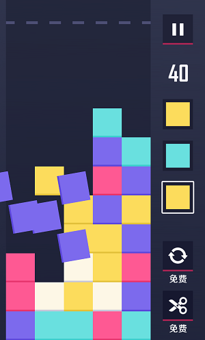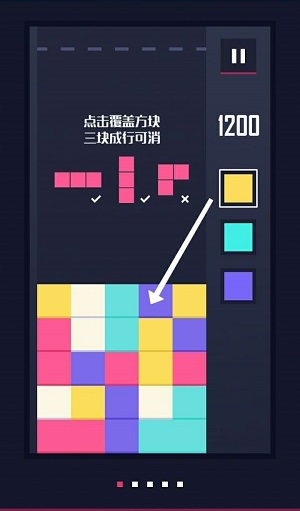 《下方了》的游戏界面中左边栏为色块填充栏,右边则显示可供操作的色块和工具。游戏一开始时会有操作说明,用简单明了的画面解释游戏的玩法。左边栏是不同颜色色块的堆叠,玩家需要选择右边栏的色块来替换左边栏色块堆中的色块,使左边栏中相同颜色的三个色块能够连成一条直线。每替换一次色块,色块堆就会向上升一格,一旦某一色块触顶,就game over。小编也可以称作消除游戏老司机了,但是到了《下方了》中因为它独特的玩法难免还是像个新手一样有些不适应,上手虽快,但没弄懂套路死得照样很快。