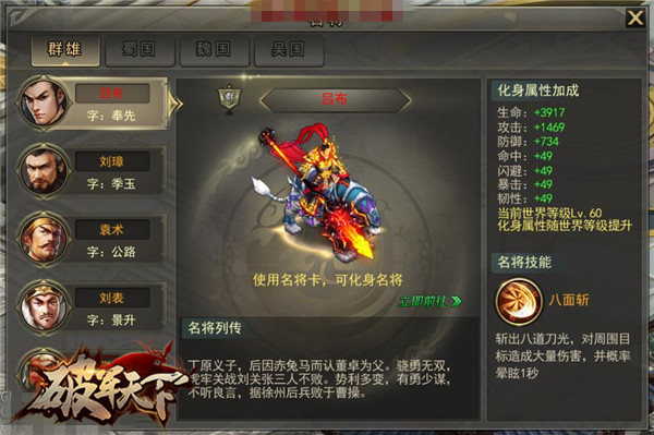 三国名将们使用的武器和玩家们的装备不同,想看名将们的绝对法宝,来破军就对了。吕布的戟,关云长的刀,张飞的矛,甚至诸葛亮的标志性羽扇也成为了独特的武器,同时,这些武器的绝技也属于根据历史设计的哦,比入诸葛亮的八卦阵,周瑜的火烧赤壁,听起来就颇有历史风韵。