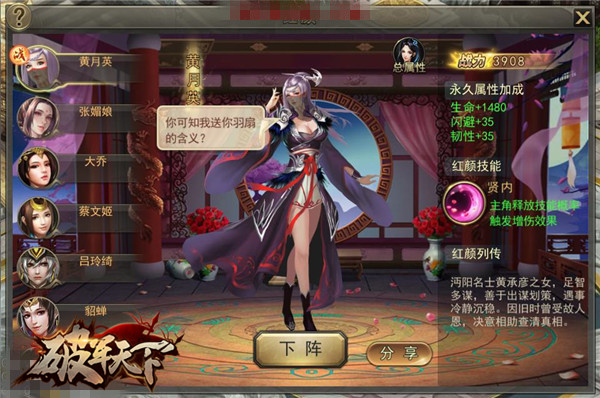 美人养成,听起来就让英雄春心波动,《破军天下》招来数位美人,从倾国倾城到文武双全,从清纯可人到妩媚娇美,总有一位和你心意。况且破军中的美人不止是外貌出众,论作战实力也不输男儿,甚至可以一直陪伴将军出征,为将军提升战力,私下不要忘记与美人互动哦。巅峰测试中美人玩法进一步精炼,成就你江山美人并存的心愿。