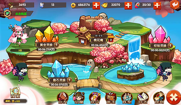 桃花坞里如仙境,一道瀑布由高山倾泻而下,恍若天成般的形成了黄金灵脉、晶石灵脉、经验灵脉。这里盛产黄金、铜钱、晶石以及经验,取之不尽用之不竭的财富只需你开启了“桃花坞”系统便可以拥有。当玩家角色等级达到33级,满山是财富的桃花坞便会向玩家开放。目前,每座灵脉产出对应资源的时间为30分钟,也可利用桃花庵产出的桃木来升级灵脉,产出的财富将会随着等级的提升而增加。