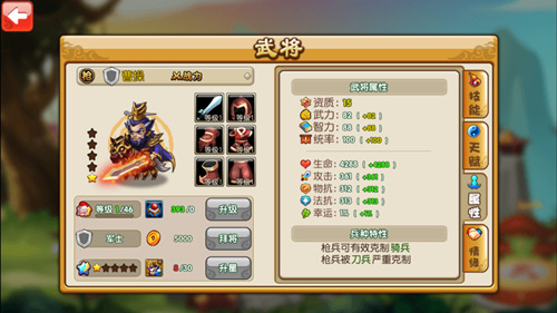 在《曹操别跑ol》游戏中,曹操不再是阴险狡诈的奸雄,而是作为武将冲锋上阵,由“你”亲自排兵布将带领三国名将一起扩展三国地图版块,成就当年曹操未完的霸业之路!那么武将曹操有哪些过人之处呢?相比于其它武将,图中曹操初始属性值高并且相对而言会较为均衡。曹操的三个主动技能中既有攻击技能也有辅助技能,攻击技能直接对将领造成伤害,辅助技能为增加全体枪兵攻击,并且效果持续到战斗结束,简直就是老大开挂带小弟一起飞的节奏。不仅仅如此,曹操的必杀技将提升全体将领攻击并且提升高大65%攻击持续时间长达五秒!可以说曹操可攻可辅全能型英雄就如同史书上记载一般。