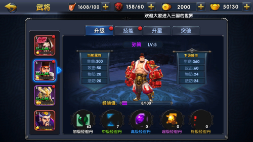 挑战关卡可以获得武将经验,扫荡关卡也可以获得经验丹,给武将进行升级,如果不够的话,在英雄试炼活动和商城也可以进行购买。