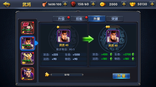 武将升星可以大幅度提升武将能力,前期从1星提升到2星和3星,还会新开一个技能。武将星级越高,可以激活越高级的羁绊效果。