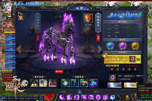 洪荒异种,能力万千。当坐骑达到一定品阶后,还会觉醒专属神化技能。目前37《莽荒纪》的坐骑最高可觉醒四种技能神通,每一种技能效果皆不同,能为修炼者带来意想不到的战斗效果。与此同时,修炼者还可以通过丹药来提升坐骑的属性,丹药亦有品质之分,品质越高的丹药属性提升越高。值得注意的是,每只坐骑有一定的丹药使用限定,提升坐骑品阶可以提升丹药的使用上限。修炼者还可以对坐骑进行觉醒化形,化形坐骑有专属酷炫的外观,坐骑化形品阶越高外观越华丽。