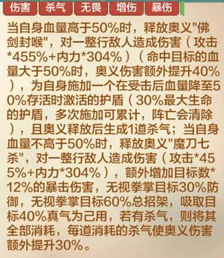 目标血量大于50%则奥义伤害额外提升40%;血量降至50%存货时激活护盾(为30%最大生命值),可叠加生成1道杀气。这里最关键的就是第2点,为什么要血量到50%时才出护盾?初衷就是让你能控制血量施放出更厉害的魔刀奥义,这个设计就是佛剑最大的亮点。可叠加就意味着你的佛剑每次都不会浪费,极大的提升了奥义价值。相比魔刀,佛剑就显得不那么亮眼罢了。