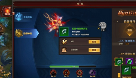神兵可大幅度提高玩家战斗力,主要分为分为生命神兵、防御神兵、和攻击神兵。